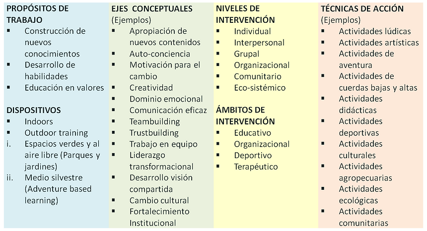 En el siguiente gráfico se presenta de manera resumida el alcance del método del aprendizaje experiencial y sus diferentes aplicaciones. Se incluyen ejemplos de ejes conceptuales sobre los cuales se trabaja y de técnicas de acción.